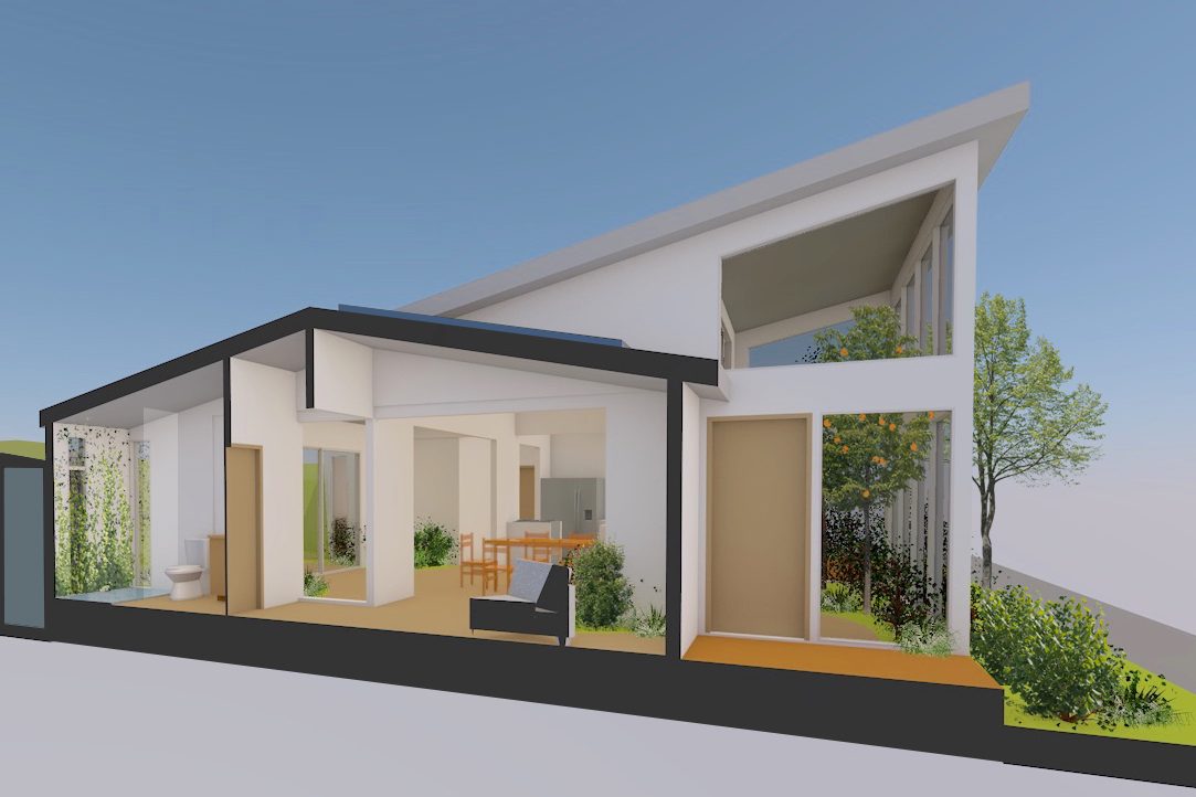 All functions become aesthetic elements in the space that show how the house collects, reuses and treats all of its water, generates heating and cooling and produces food in multiple locations in and around the structure.
