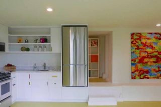 This "creative surgery project" turned a partial basement into a playful, light flooded studio. Several custom built-ins conceal the complicated geometry of the existing former crawlspace and make optimal use of the 548 SF footprint.